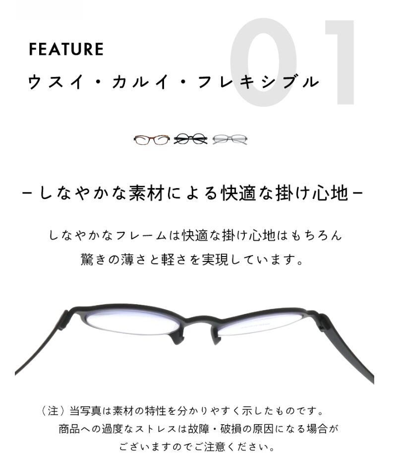 しなやかフレームは快適な掛け心地はもちろん驚きの薄さと軽さを実現しています。
