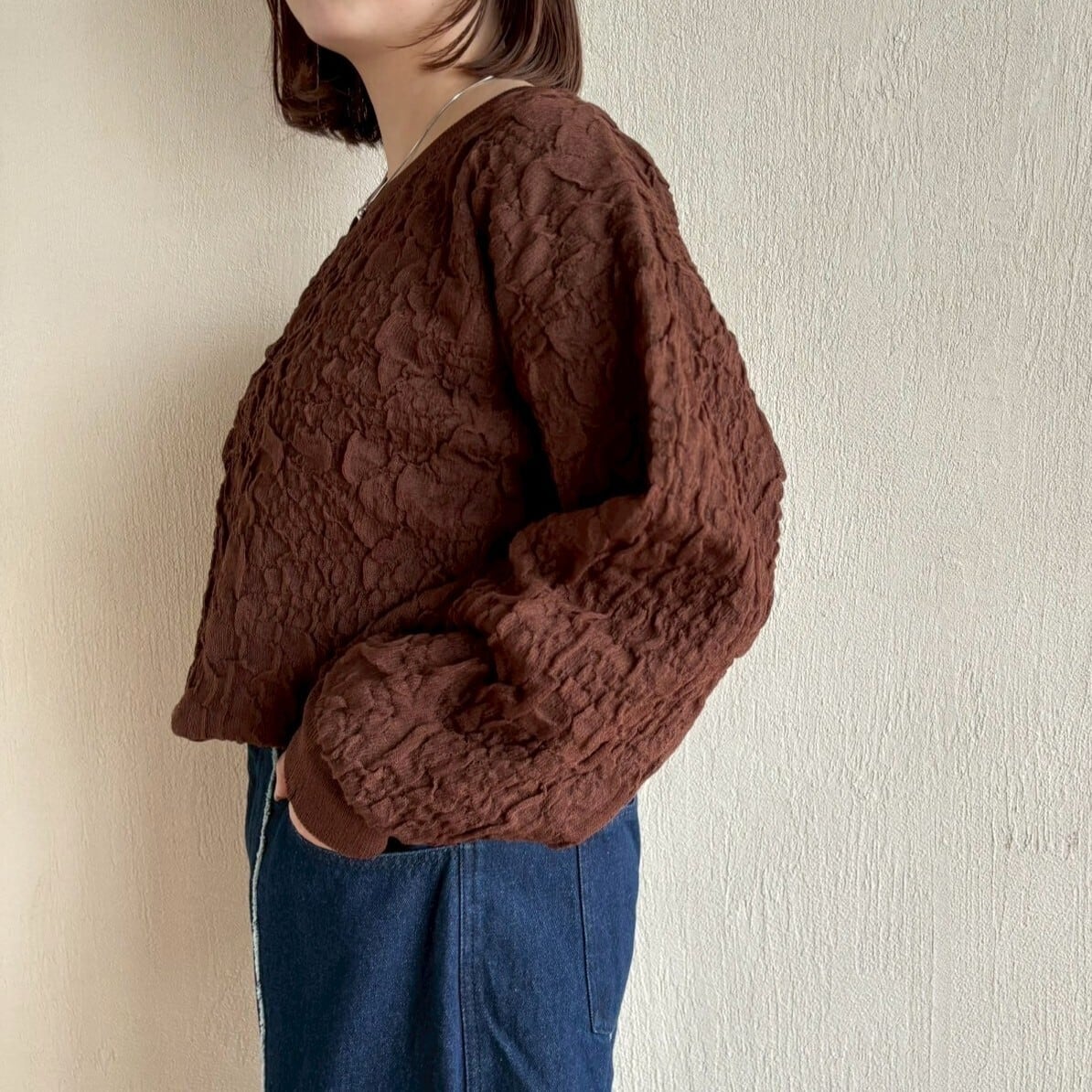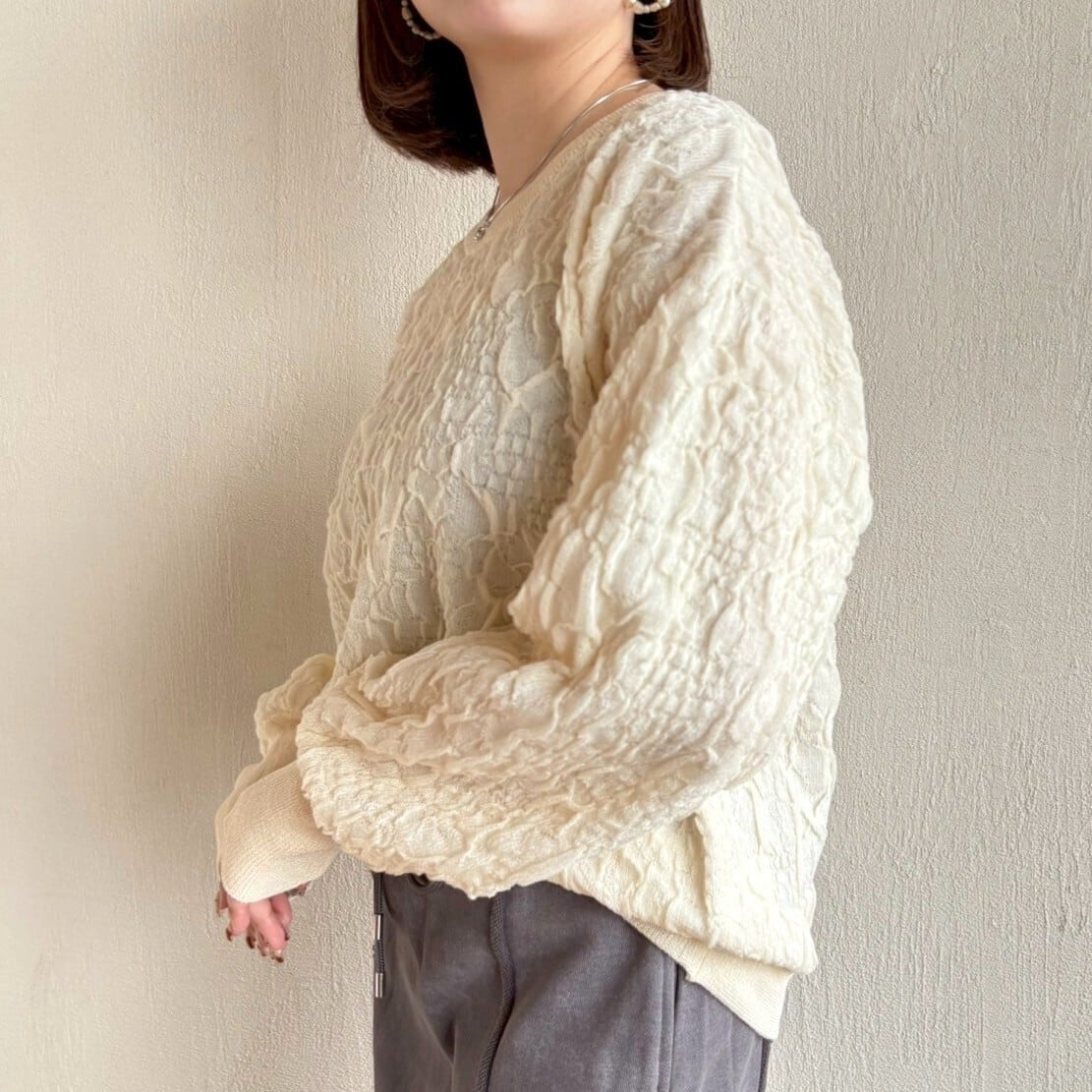 凹凸感のあるふくれジャガードの編地が印象的なクルーネックニット。