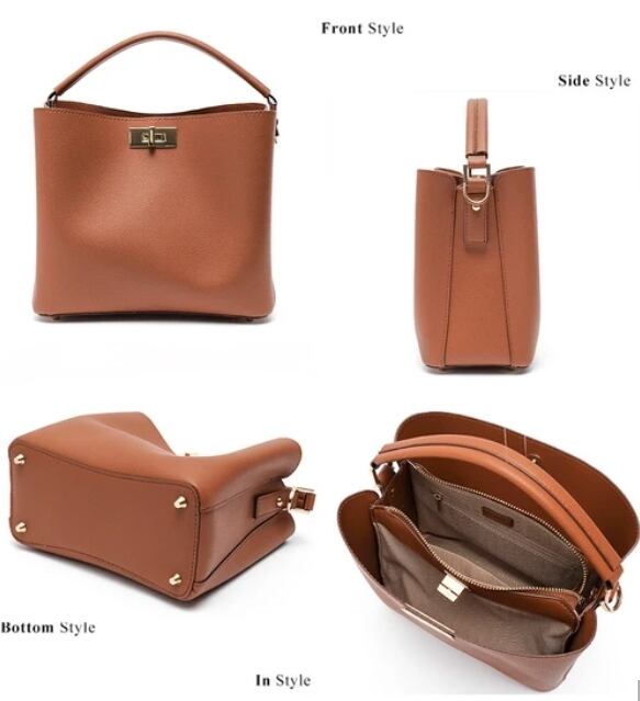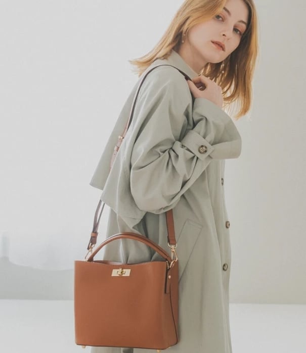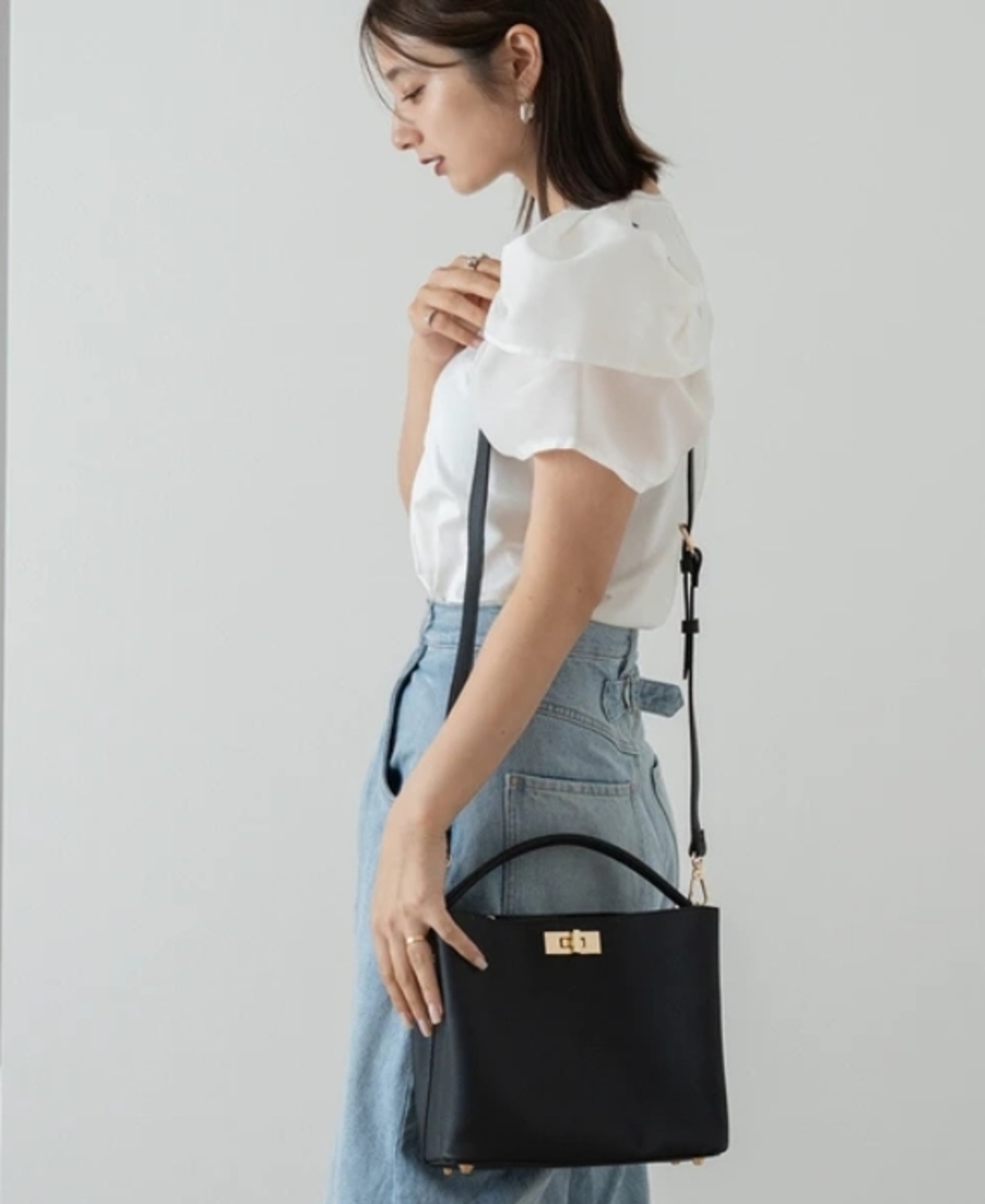 四角い回転金具が目を引くワンハンドルハンドバッグ。