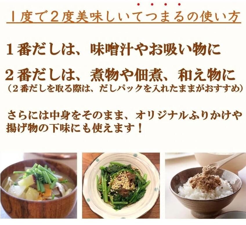 ※1度で2度美味しいてつまるの使い方:1番だしは、味噌汁やお吸い物に、2番だしは、煮物や佃煮、和え物にも美味しく使えます。