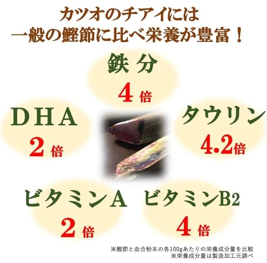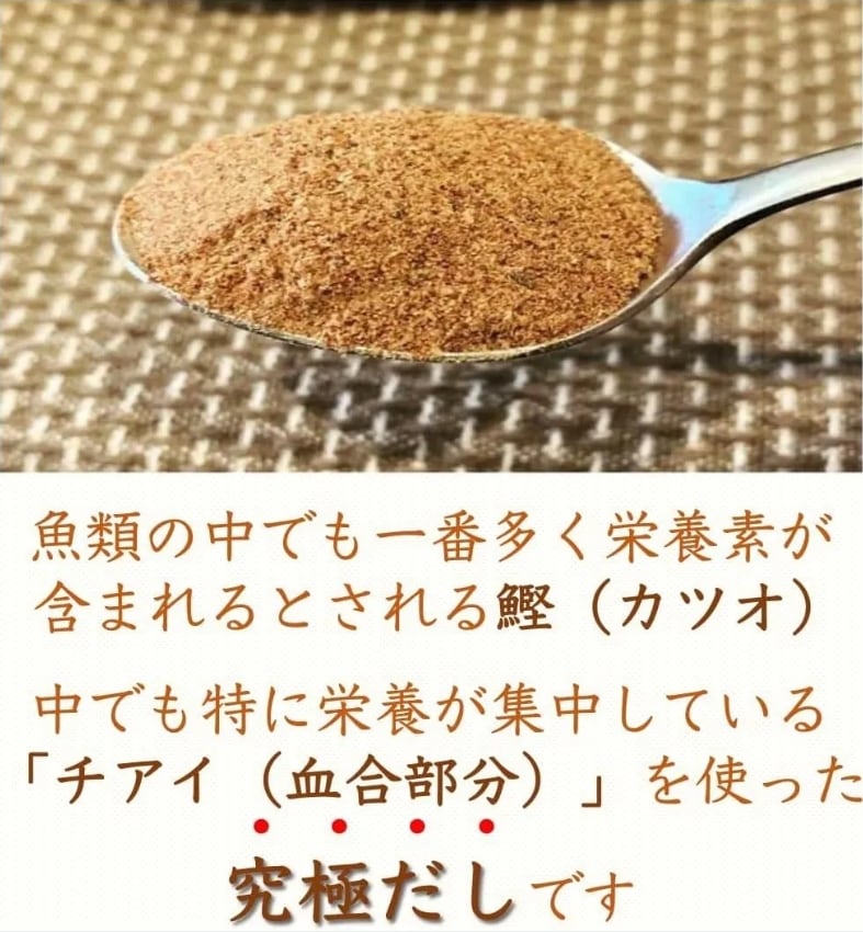 かつおの血合いを使用し、かつおの魅力「栄養価」をギュッと濃縮した『カツオ粉(粉末だし)』です。