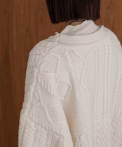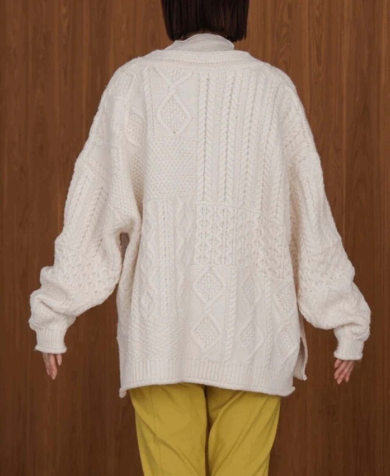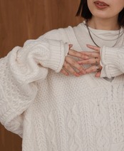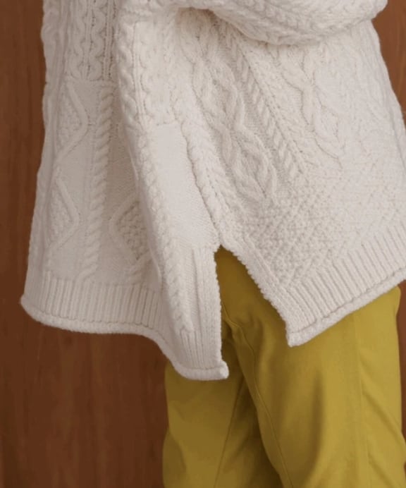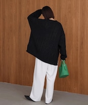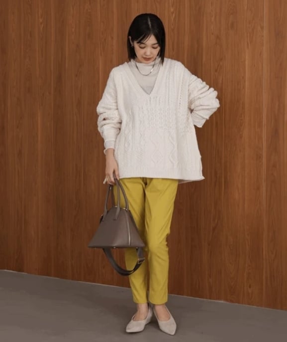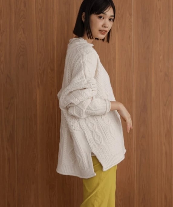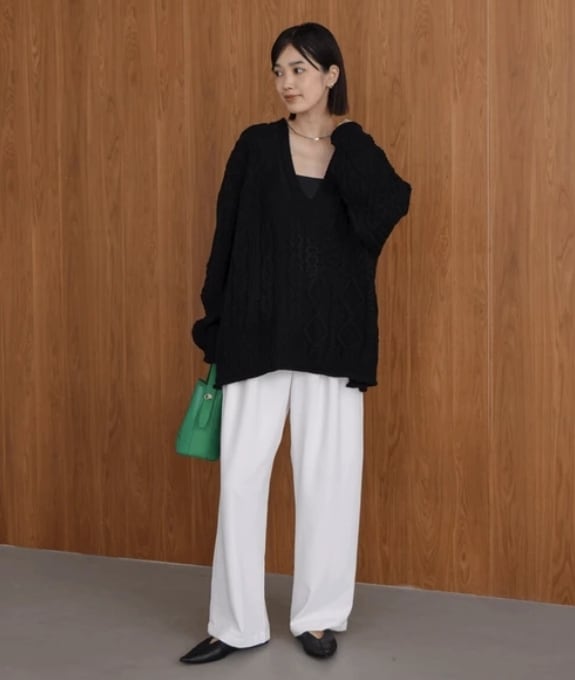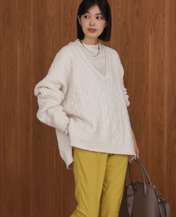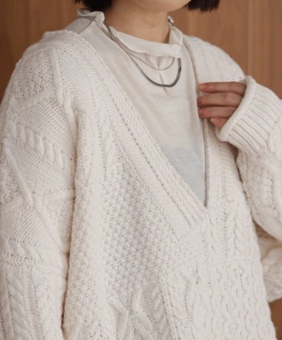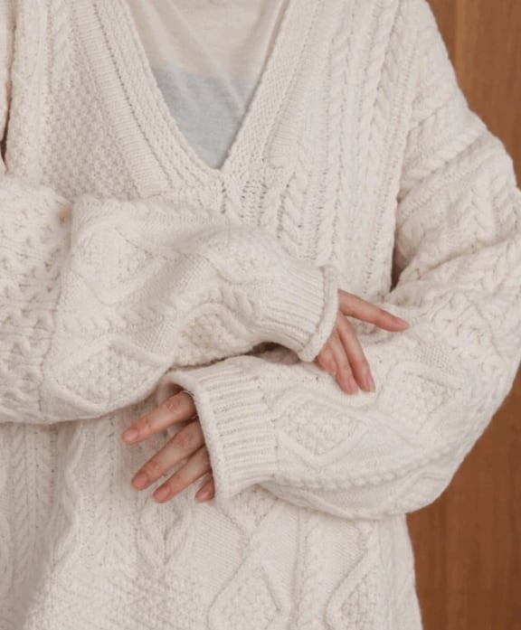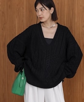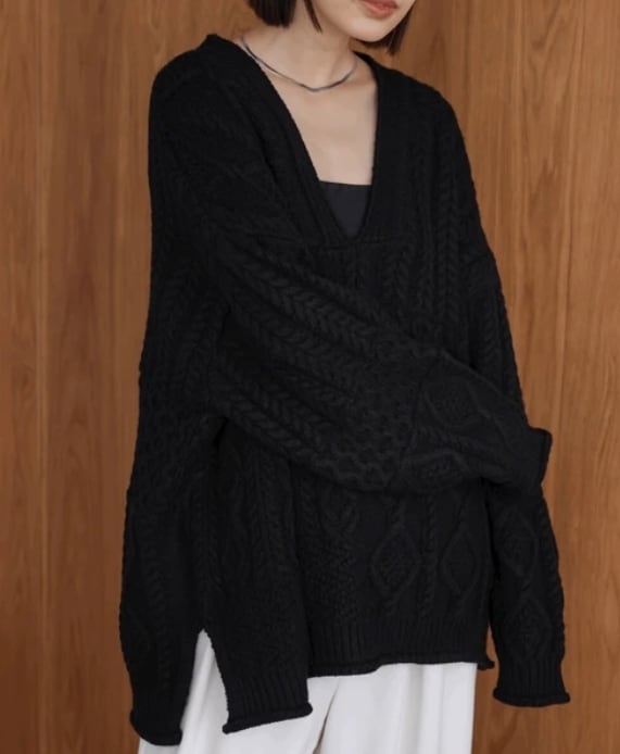 トレンド感たっぷりの深めVネックが魅力のケーブルニット。