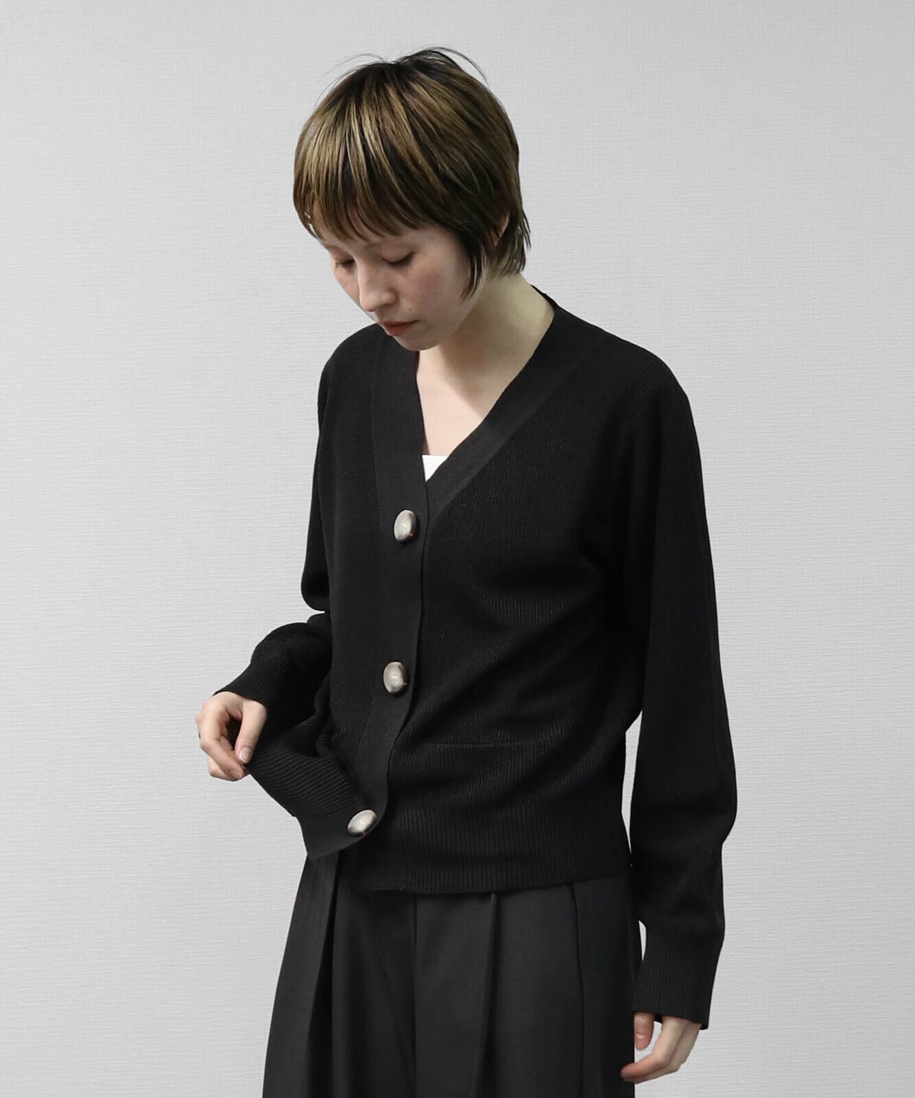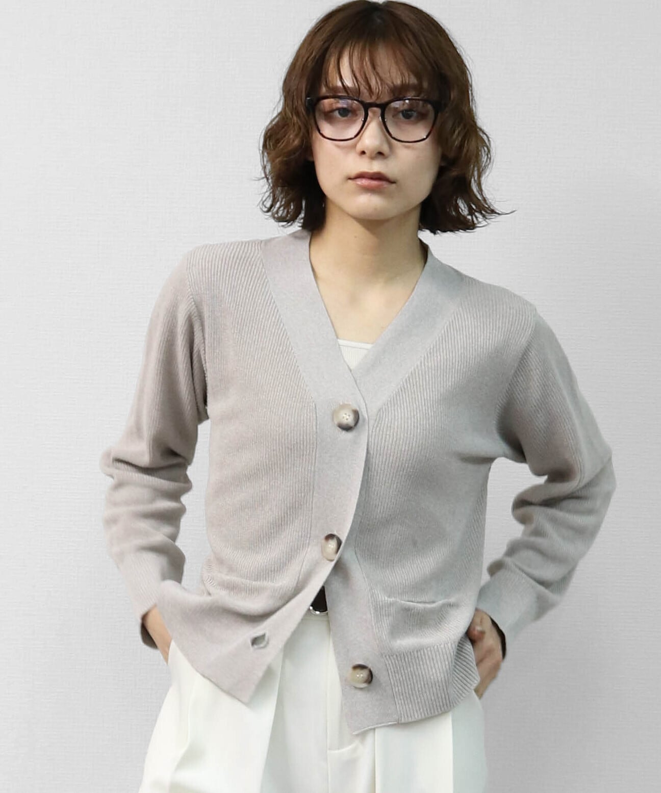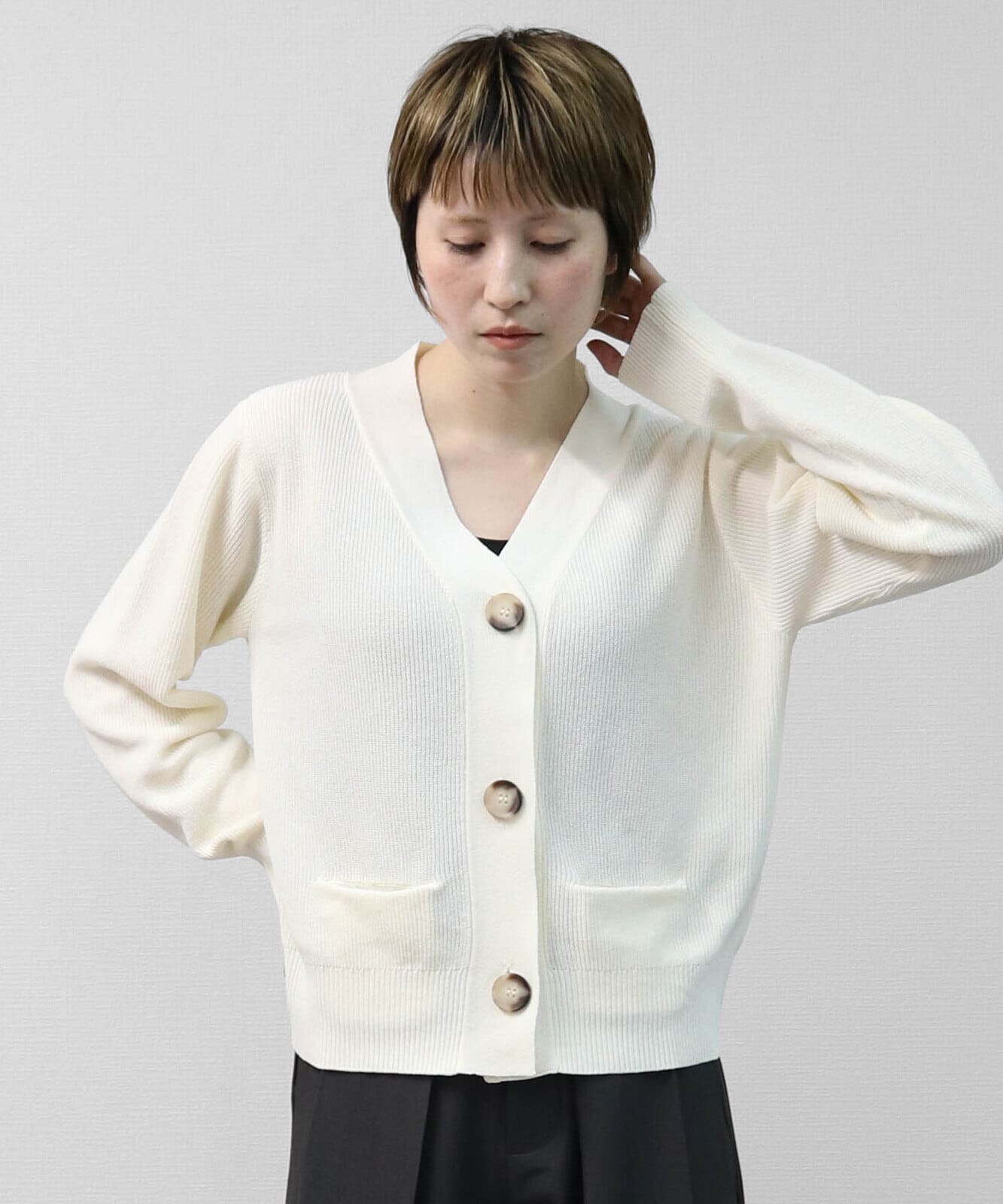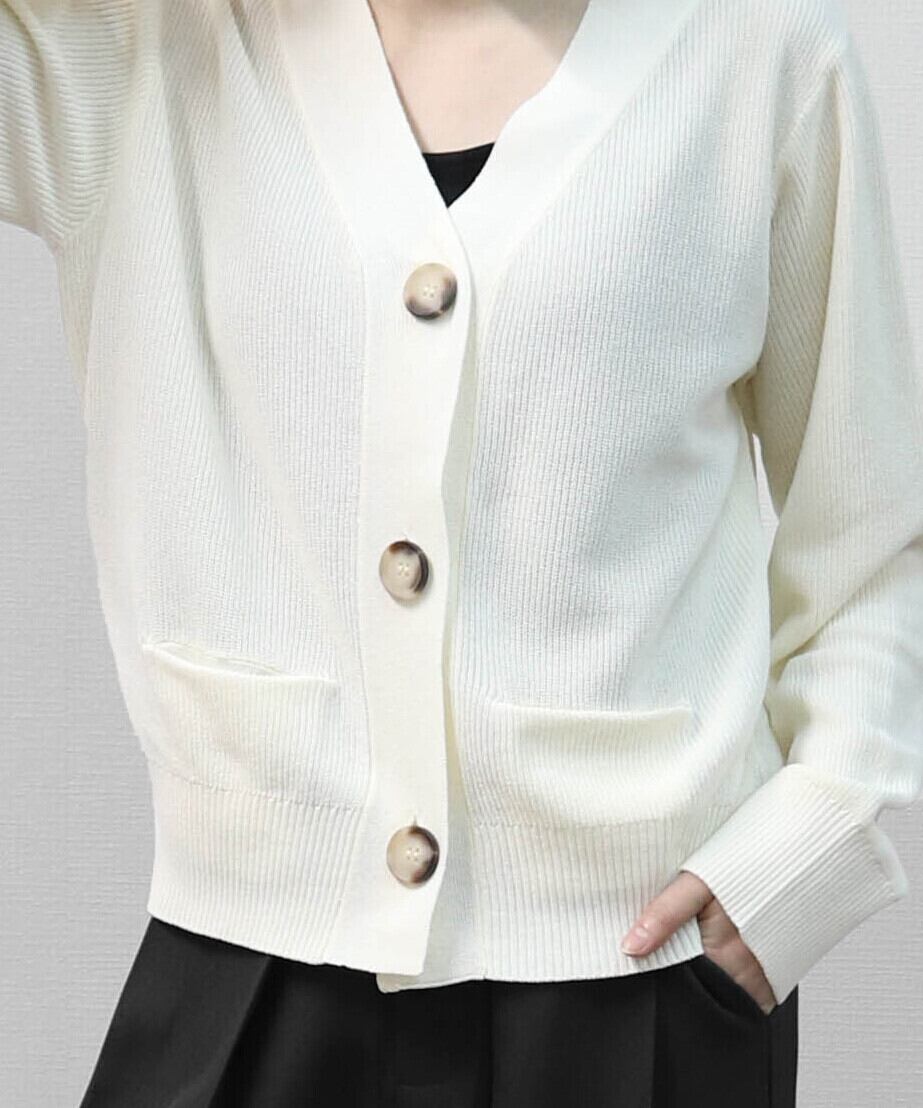 片畦編みの立体感で、きれいめに見えるBIGボタンカーディガンです