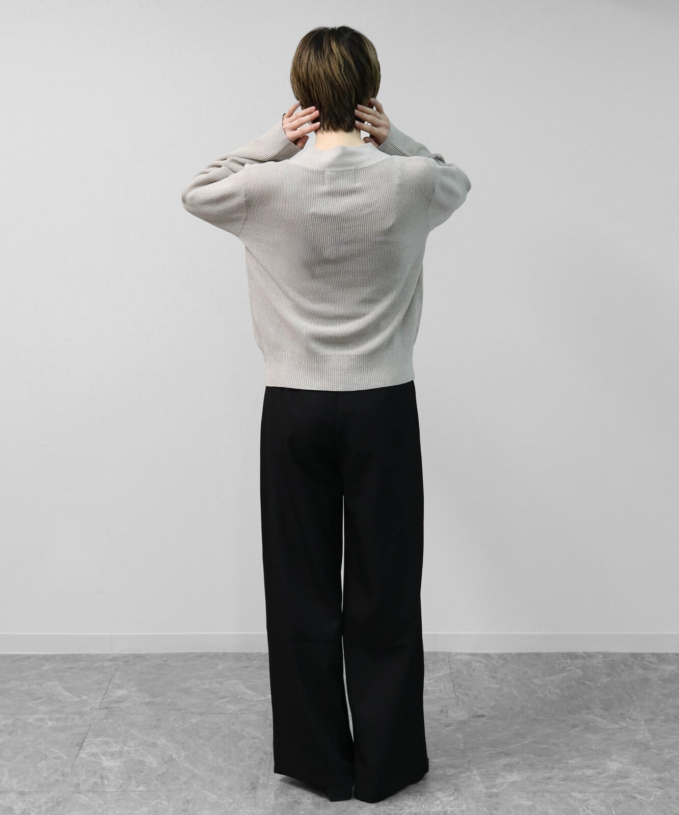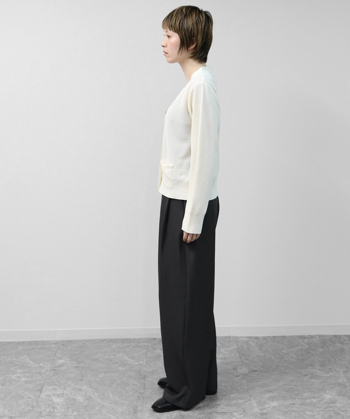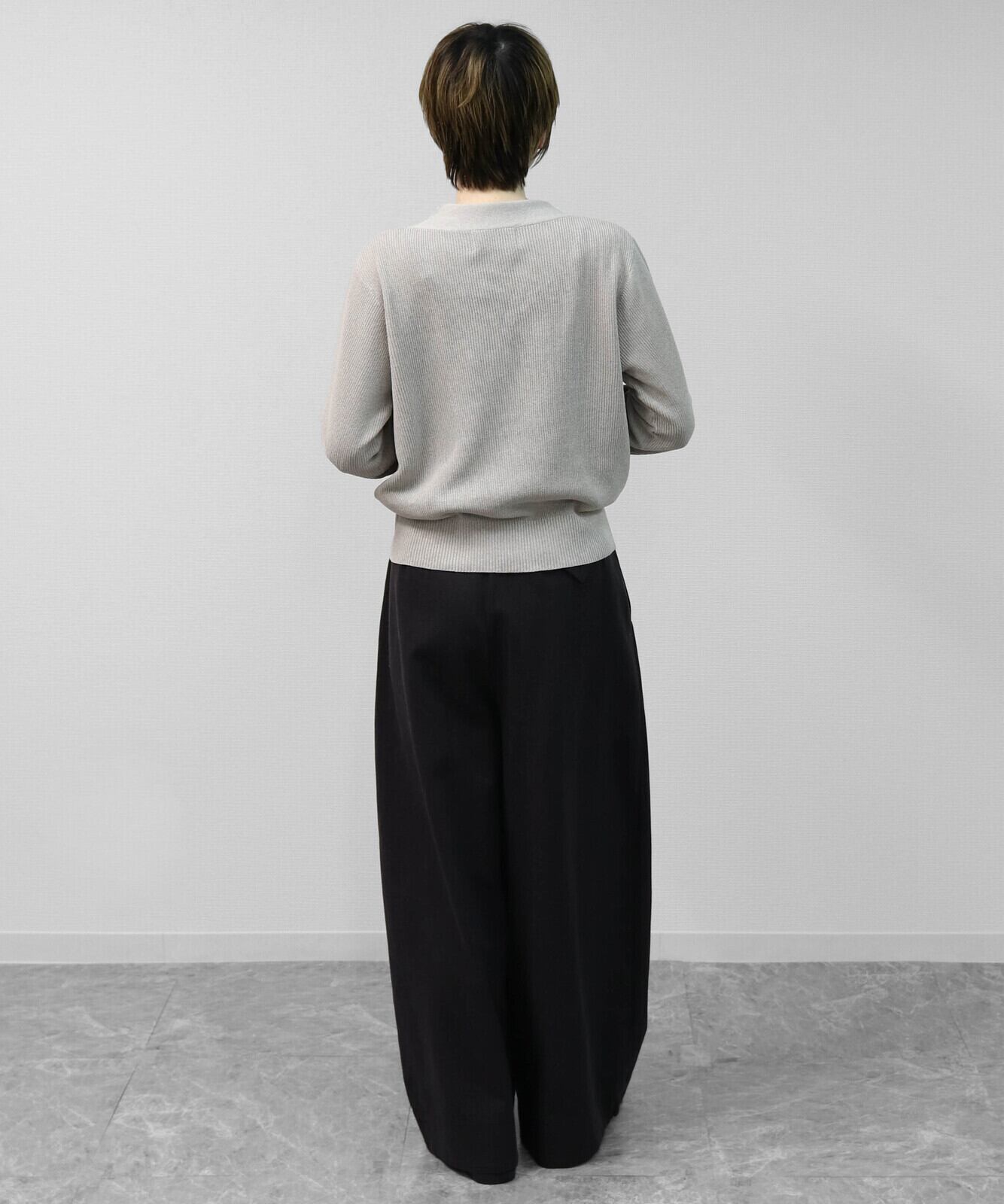 素材は、ハイツイストヤーンらしい、さらっとドライで肌離れの良さを感じる見え方。ポリエステル×再生ポリエステルで軽さが出やすく、毛羽立ちが目立ちにくいタイプなのでデイリーに扱いやすい印象です。片畦編みの厚みでペラつかず、立体感あるシルエットがきれいに保たれます。