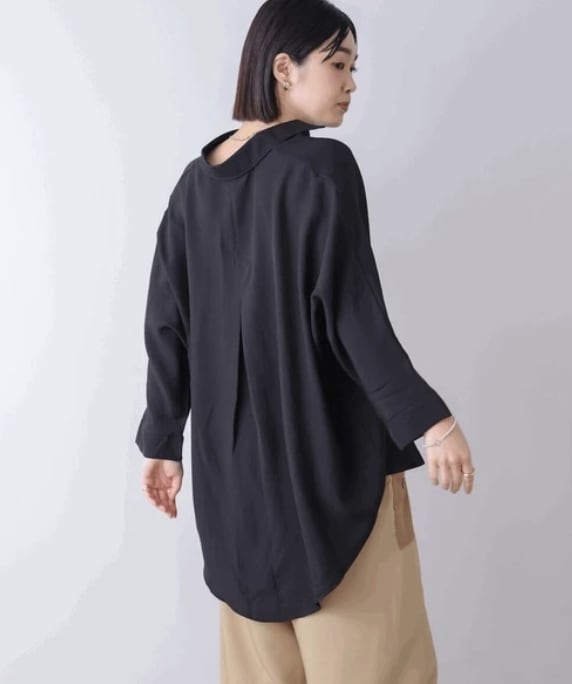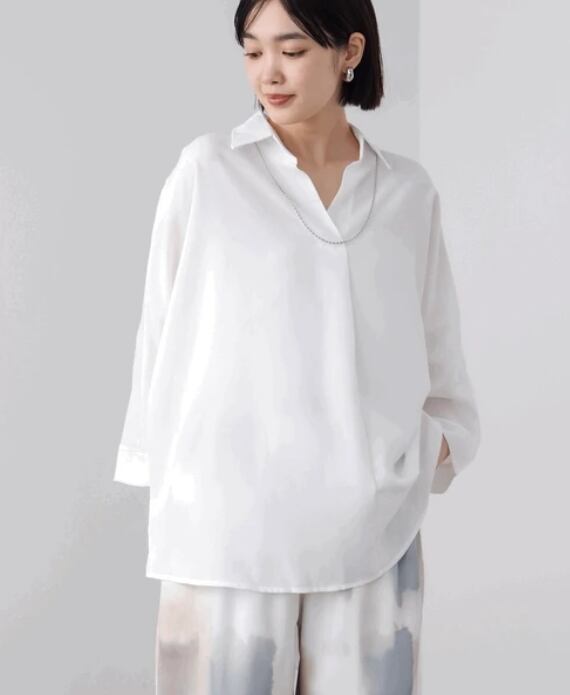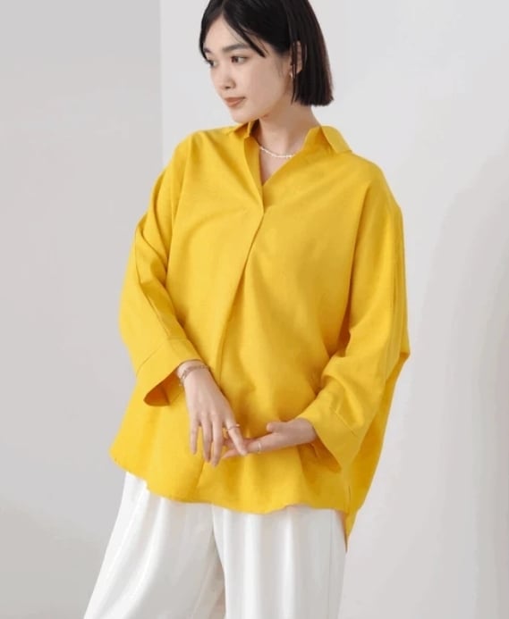 首元をすっきり見せるスキッパー衿が、ほどよくクールな印象をプラス。
