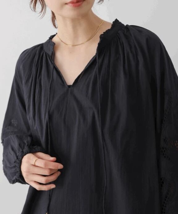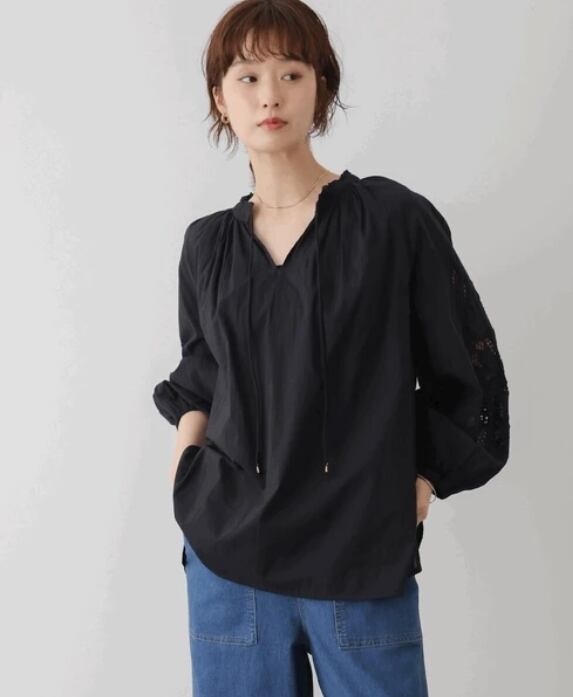 袖にあしらったカットワークレースが目を惹き、シンプルな中にもさりげない華やかさを添えてくれます。